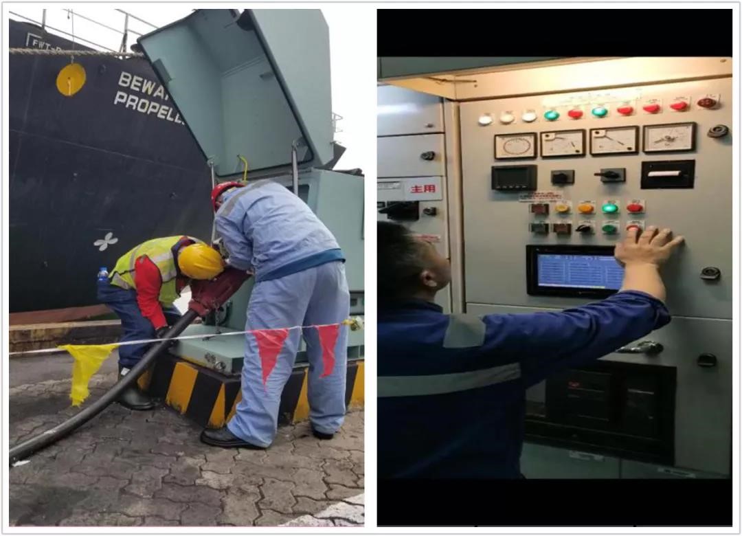 924日下午接到客戶緊急連船任務后,智光電氣技術港口部與技術服務部立即協調人員趕往現場,并在25日對兩套岸電設備進行全面檢查及通電調試,與船方、港方溝通確定連船方案。926日,智光電氣技術岸電系統分別在802#泊位、803泊位,與神華521”輪發電機實現一次性成功并網、解列任務!